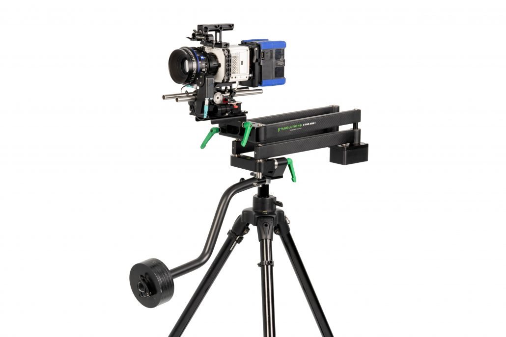 The C-Pan Arm II is a very unique camera guide contraption that mechanically can move a camera in a variety of different paths; straight pan, outward curve, inward curve, horizontally, vertically or at a sloped angle or even forward or backward moves.