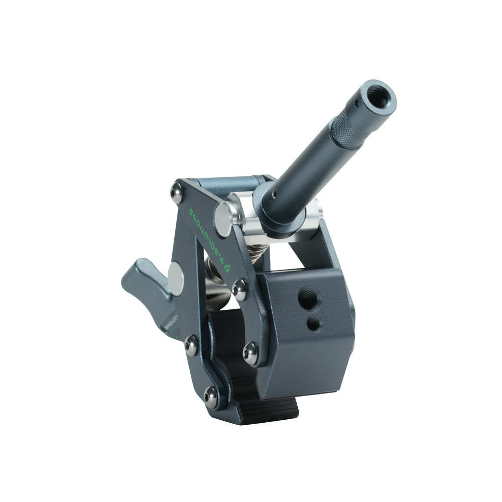 The Savior Clamp with stud is fitted with a 3,5In long, 5/8” stud/baby pin (3/8” end tapped) and it is tapped with one 1/4″-20 and one 3/8″-16 female threaded hole on each jaw. This makes it possible to mount multiple pieces of equipment on one clamp. All Savior clamps feature an anodized aluminum surface for added durability and longevity.